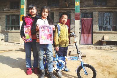 當記者詢問蛋寶是否還記得自己許下的春節愿望時,他害羞地回答:我想要一輛自行車,我的兩個姐姐想要兩個芭比娃娃。”“你們的愿望全部實現了!”齊老師和韓老師從箱子里掏出一輛折疊兒童自行車、兩個芭比娃娃、一個新書包及若干新文具。蛋寶頓時看傻了眼,他在開心之余,更想對愛心人士道聲感謝。