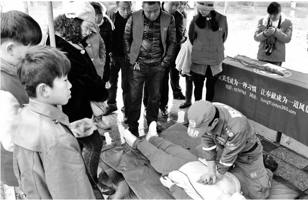 3月5日,在市區平陽廣場,臨汾藍天救援隊的青年志愿者們為市民講解如何正確地對昏迷人采取急救措施,以此提高市民對突發事件的應對能力,大力弘揚奉獻、友愛、互助、進步的志愿精神。