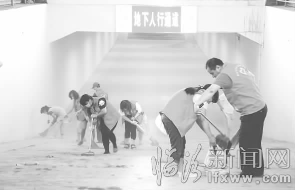 臨汾新聞網訊 5月31日,臨汾市青年志愿者協會20余名志愿者帶著掃帚、鐵鍬、抹布到西關彩虹橋下,打掃地下人行通道,還市民一條干凈、整潔的地下通道。記者 張蘊強 攝影報道
