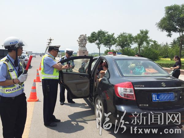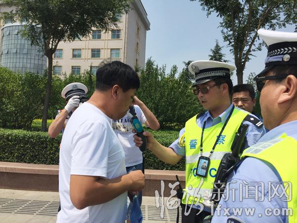 一輛斯柯達(dá)小汽車在即將駛?cè)霗z查區(qū)域時停下來,司機(jī)與副駕駛乘客換位置,交警立即上前查看,并將原司機(jī)帶到一旁對其進(jìn)行酒精檢測。司機(jī)表示,中午喝了點“漢斯小木屋”所以害怕了。