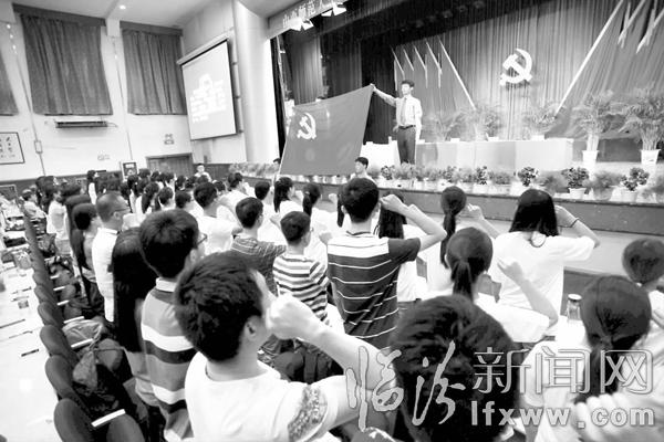 臨汾新聞網訊 7月1日,在中國共產黨建黨94周年之際,山西師范大學黨委在校文化活動中心舉行了新黨員入黨宣誓儀式,該校497名新黨員面對鮮紅黨旗莊嚴宣誓。 饒二保攝
