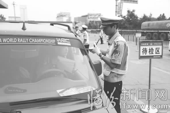執勤交警對過往車輛的滅火器、三角牌進行檢查。