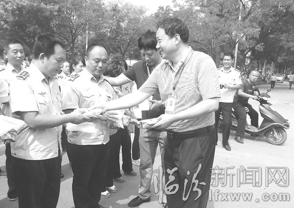 臨汾新聞網(wǎng)訊 8月10日,堯都區(qū)鄉(xiāng)賢街辦事處領(lǐng)導(dǎo)和企業(yè)家一行,在臉譜大橋附近慰問了在酷暑下仍堅(jiān)守一線的南城大隊(duì)的市容執(zhí)法隊(duì)員,并為他們送去了防暑降溫用品。記者 梁麗攝