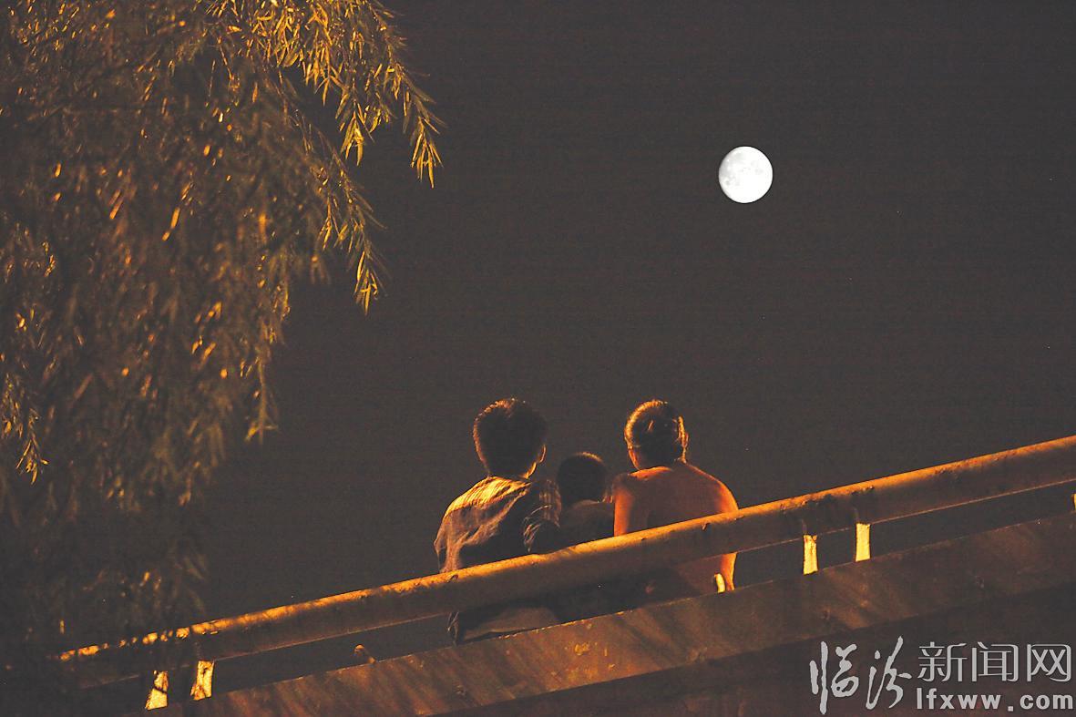 9月26日晚,濱河路彩虹橋上一家三口在賞月。 記者 趙文家 攝