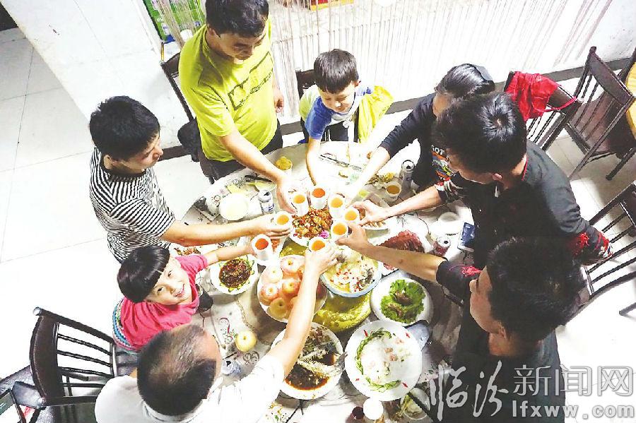 9月26日,家住體育南街環城南巷的包涵爍一家團聚在一起,由于兒女們都在外地工作,只能提前歡聚。隨著飯菜上桌,大家一同舉起酒杯,歡樂的笑聲在家里響起。 記者 潘華玲 攝