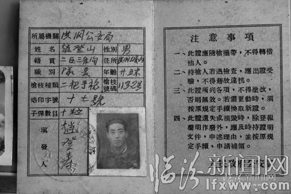 經過一番思量,趙登山的兒子趙先生小心翼翼地拿出了兩個小本說:這是我父親留給我們的遺物,很多年了我們也沒有研究過?!庇浾咭彩堑谝淮我姷竭@么陳舊的持槍證,分別頒發于1950年和1952年。