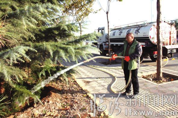 臨汾新聞網訊 連日來,市城市綠化二隊出動灑水車,開啟澆水泵,搶抓時間,對轄區內所有綠化苗木開展冬澆,確保所有綠化苗木在上凍前能夠吸取更多養分,順利過冬。圖為綠化人員正在給樹林澆水。 記者 李嬌 攝