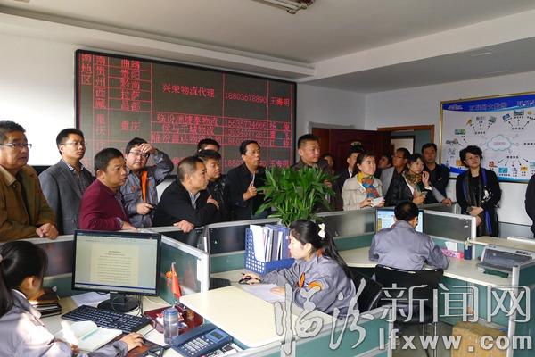 在興榮物流公司自主研發的交通運輸物流公共信息平臺監控室,考察團一行聽取公司負責人平臺運行情況介紹,對興榮公司投入巨資研發建設的物流聯盟公共信息平臺贊嘆不已。