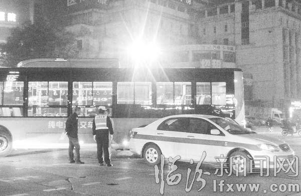 臨汾新聞網訊 11月8日18時許,在市區五一路與鼓樓南大街十字路口,一輛車牌號為晉LPL91X類似出租車模樣、裝有計價器的黑出租,同一輛新型公交車發生刮蹭,引發該路口堵塞。 記者 張蘊強 攝