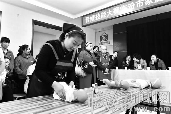 臨汾新聞網訊 1月2日,臨汾家庭服務業協會舉辦了晉嫂技能選拔大賽,我市近20家家政公司的選手在養老護理、孕嬰護理、家庭保潔三個項目中展開了激烈的競賽。圖為:帥管家家政公司員工正在展示如何正確護理嬰兒。記者 陳華攝