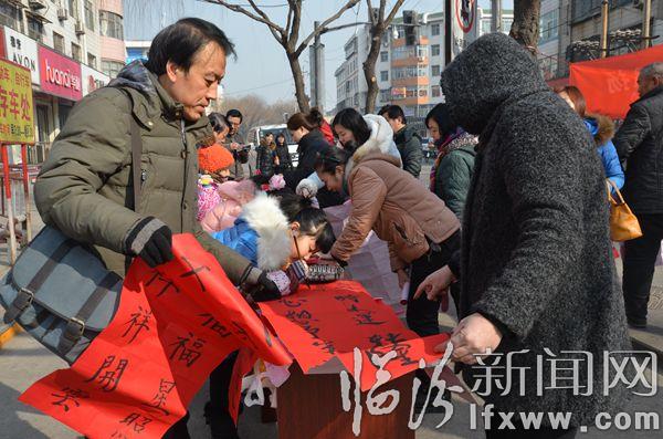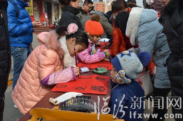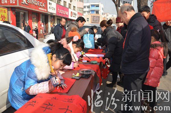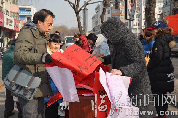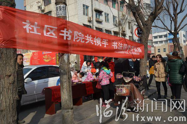 活動現場,蘭亭書院的師生向社區居民及過往百姓義務書寫近百幅春聯,其中有楷書、篆書和行書、草書,學生寫的春聯被一搶而光。