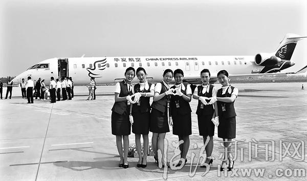 臨汾新聞網訊 5月19日,臨汾民航機場正式開通“重慶=臨汾=天津”航線,從臨汾到天津約一個小時,臨汾至重慶約兩個小時。首航航班由華夏航空CRJ-900飛機執飛,航線每周二、四、六各一班。圖為工作人員在合影留念。 記者 閆銳鵬 攝