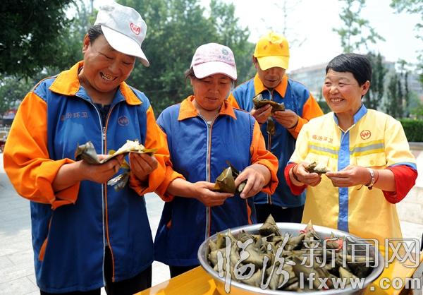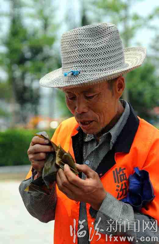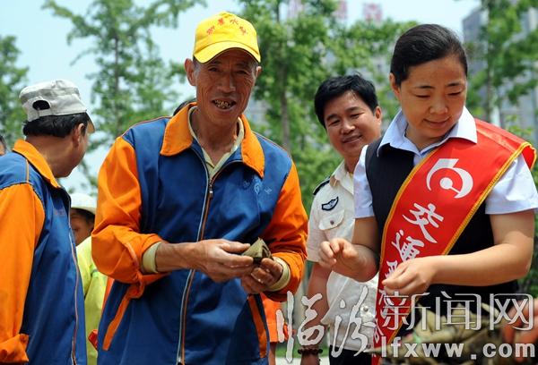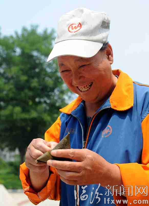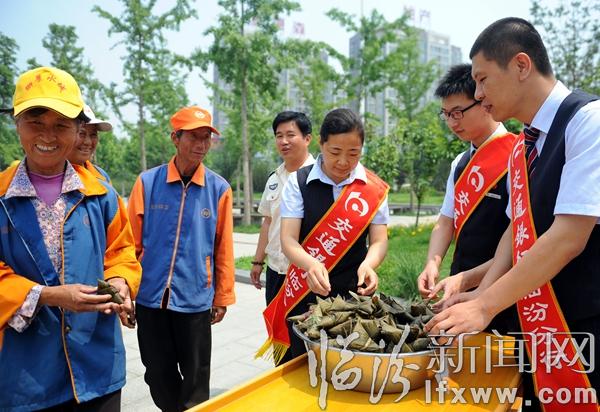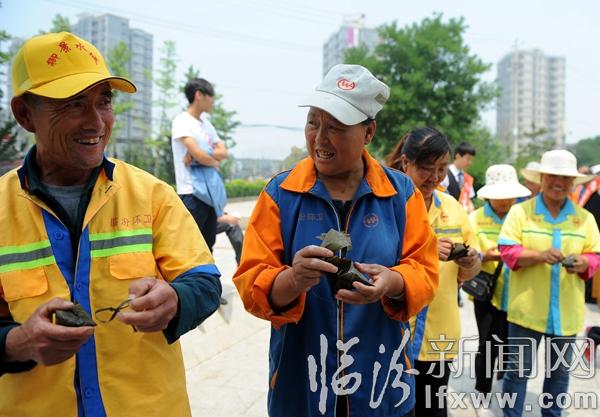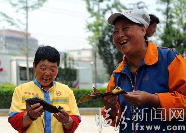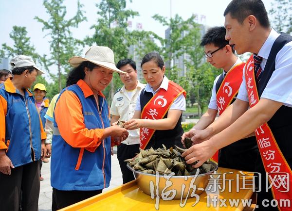 臨汾新聞網訊 6月8日,臨汾市環衛局城東環衛所的一線環衛工人高興的收到了愛心粽子。當日,交通銀行臨汾分行的青年志愿者們為該所的100余名環衛工人送去了愛心粽子,感謝他們為城市清潔付出的努力,為他們送去端午佳節的慰問和祝福。 記者 閆銳鵬 攝