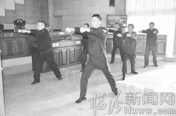 臨汾新聞網訊 臨汾鐵路運輸法院法警大隊注重平時訓練工作,提高隊伍整體素質水平,為庭審安全做好功課。圖為,日前隊員正在進行擒拿操訓練。