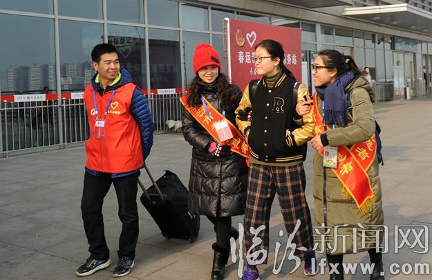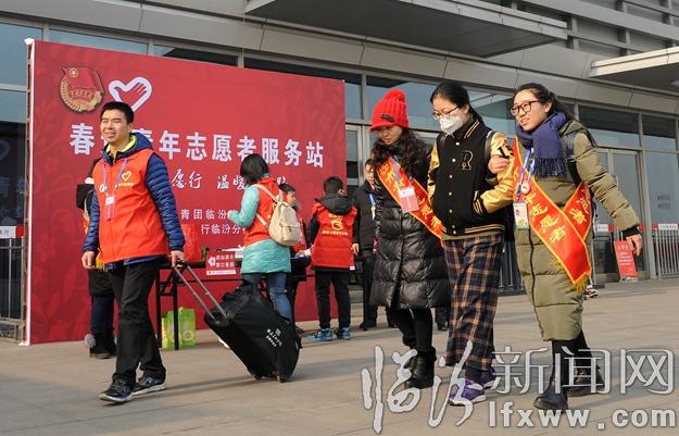 臨汾新聞網訊 1月18日,在臨汾西站,臨汾春運青年志愿者在幫助一名乘客前往候車室。在臨汾工作的陜西籍董婷女士因不慎扭傷了左腳,回西安老家出行造成很大困難,臨汾市春運青年志愿者服務隊聞訊后,成立3人愛心幫扶小分隊,取票、搬運行李、進站、候車、乘車進行了貼心的志愿服務,以認真務實的態度讓寒冬里的回家路有了濃濃的暖意。