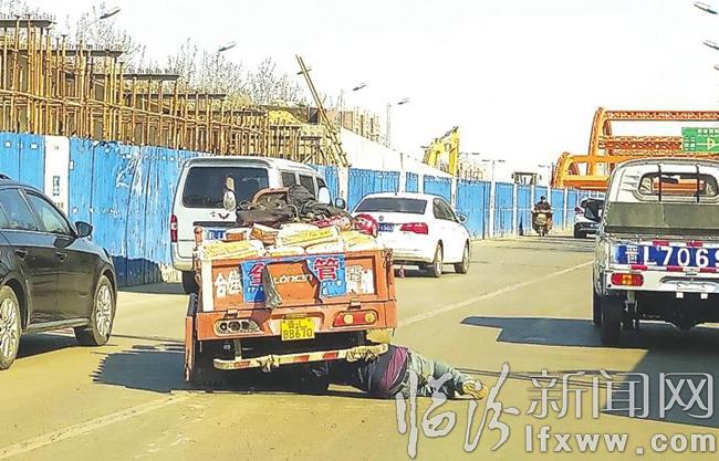 臨汾新聞網訊 3月8日下午,在鼓樓西汾河大橋西南側,一輛滿載著貨物的三輪車在路中間“趴窩”,駕駛員則鉆到車下進行維修。記者注意到,此處高架橋工程正在施工,僅剩兩個車道可通行,而這輛三輪車駕駛員卻任性地在路中間進行修理,實在不該。