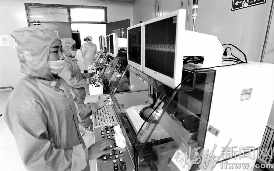 臨汾新聞網訊 山西飛虹光電科技集團有限公司主要從事大功率LED外延片、芯片、薄膜太陽能電池等的研發與生產。項目總投資30億元人民幣,項目總體建成投產后可實現年產大功率外延片300萬片、芯片50億只、薄膜太陽能電池板50MW,企業可直接實現年產值100億元人民幣。圖為該公司工作人員正在加工LED芯片。 記者 魏華 攝