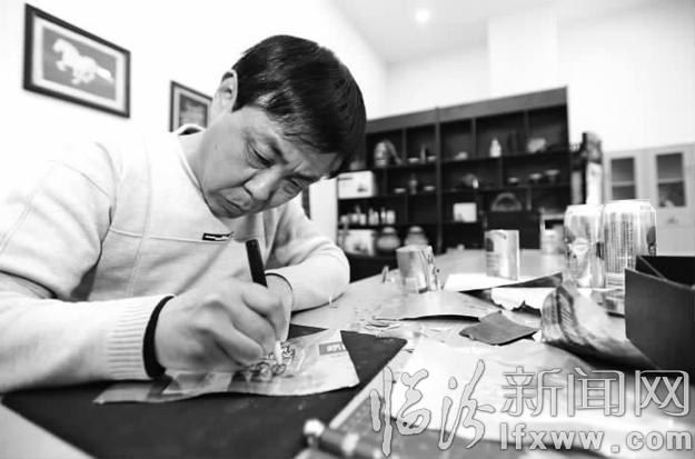 高保安在工作室用廢舊易拉罐創(chuàng)作作品。