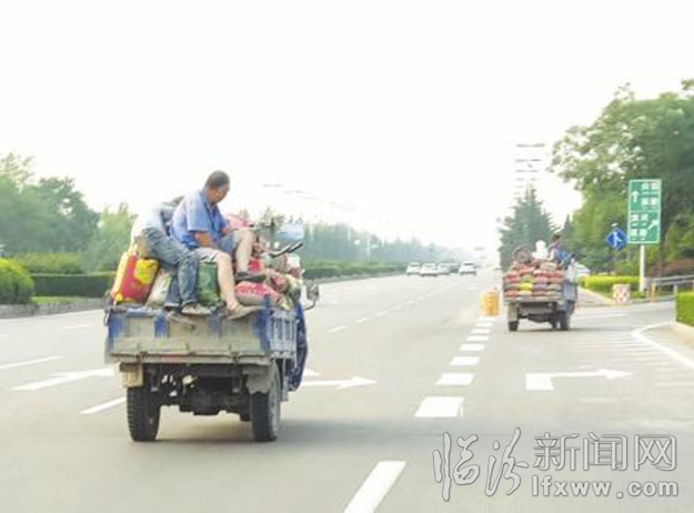 臨汾新聞網訊 6月26日,在濱河路上,一輛滿載貨物的農用三輪車上坐著兩個人,這兩人的部分身體懸在車外,一旦車輛顛簸,極易墜車。