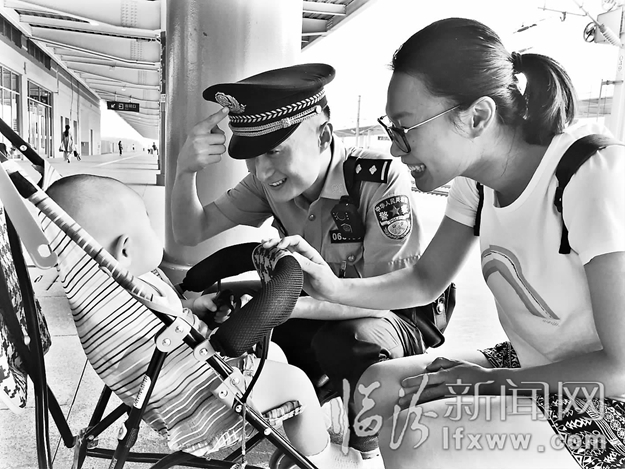 臨汾新聞網訊 7月3日,臨汾西火車站派出所執勤民警在和小乘客做小游戲。進入暑運,臨汾鐵路公安處臨汾西火車站派出所結合實際情況,在通過開展微笑服務的同時,全面加強安檢措施,嚴格采取“機驗”和“人驗”相結合的方法,嚴卡進出站通道,對旅客人身和攜帶行李物品進行全面覆蓋安檢,確保暑運期間廣大旅客乘車安全。