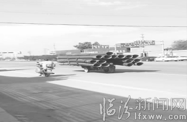 臨汾新聞網(wǎng)訊 8月11日,記者途經(jīng)108國(guó)道靳家莊路段時(shí),看到一輛三輪車(chē)滿(mǎn)載管道緩緩由北向南行駛。因管道過(guò)長(zhǎng),且置于司機(jī)頭頂,司機(jī)只能彎曲身體駕駛。