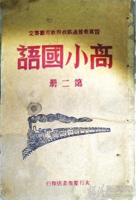 豎排版的晉冀魯豫邊區政府課本,黃色封面寫著“晉冀魯豫邊區政府教育廳審定”,高小國語”比上面的字大好幾號。