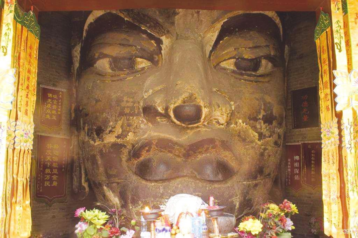 佛頭生鐵鑄造而成,高6.8米,寬3.8米,周長16米,重15噸。頭像外面披麻灰,還加了彩繪、貼金。因當地傳說撫摸佛頭會給人帶來好運,所以佛頭人手能觸及的地方,被摸得油光發亮。佛頭內部中空,后部有一方孔,用以存放經書。從孔內查看,整個佛頭由300多塊長寬各約50厘米、厚約6至10厘米的生鐵鑄接起來,佛頭頂部還有鑄造時留下的范孔。