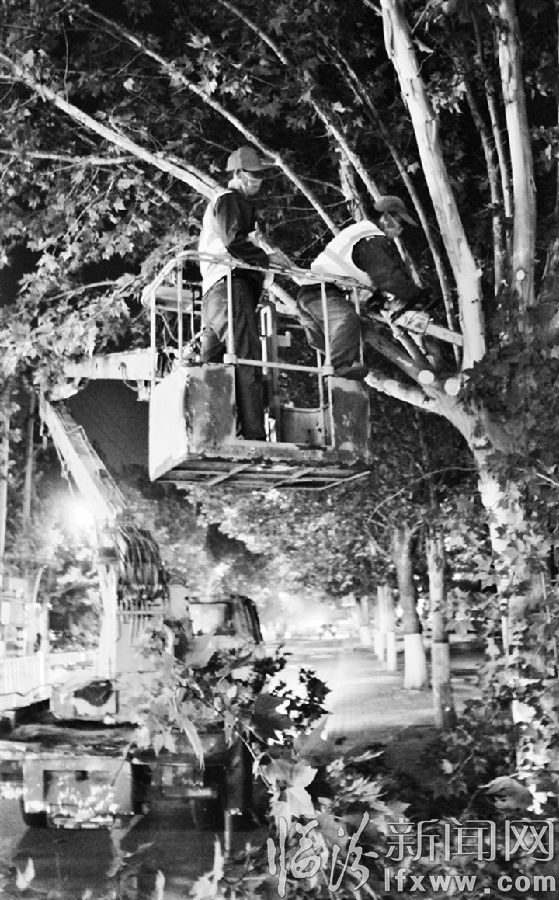 臨汾新聞網(wǎng)訊 夏季的行道樹樹葉茂盛,部分樹葉影響了行人的正常出行,6月3日,市綠化一隊(duì)對市區(qū)平陽南街的行道樹進(jìn)行修剪,由于此地地處鬧市中心,交通壓力大,白天修剪樹木可能會造成交通擁阻。為此,該隊(duì)采用夜間作業(yè)的方法,盡量減少對市民正常出行的影響。