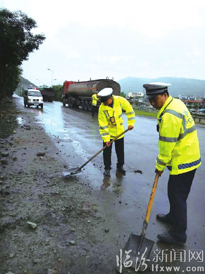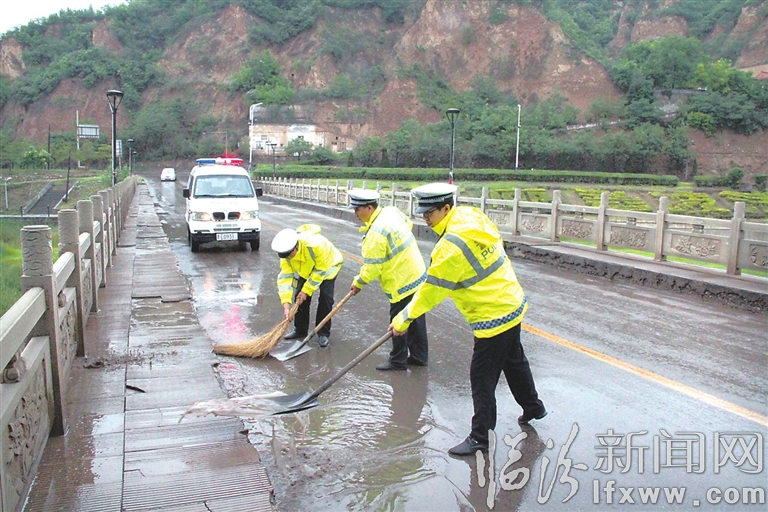 連日來,古縣雨水天氣造成路面嚴重積水,轄區澗河橋路面積水給過往行人造成極大的不便。大雨過后,古縣公安局交警大隊民警集體趕赴一線,及時排查路況,清理積水、泥石流,擺放警示牌,確保駕駛人安全通行。(孟繁霞 攝)