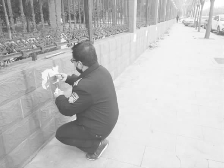 “前一天我們巡查時還沒有,這都是晚上貼的。”據(jù)工作人員介紹,貼小廣告者往往與市容監(jiān)察人員“打游擊”,趁他們下班悄悄貼。“這樣的墻面不平,不能用鏟子,只能用手一點點扒、一點點摳,不易清理,往往我們清理的速度趕不上他們貼的速度,讓人防不勝防。還有往墻面、地面、下水道蓋上刷涂料的,十分影響市容市貌,希望他們能提升公德意識,維護城市容貌。”