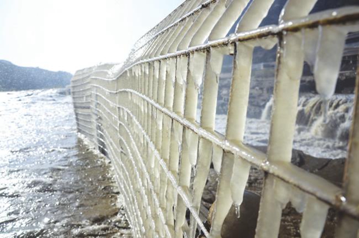 據壺口景區相關負責人介紹,近來受天氣影響,瀑布兩岸的巖石和護欄上出現了美麗的冰掛。太陽出來后,在瀑布上方還會出現彩虹,為冬日的壺口瀑布平添了幾分秀色。在大面積冰掛流凌美景的襯托下,波濤洶涌的壺口瀑布更為壯觀。