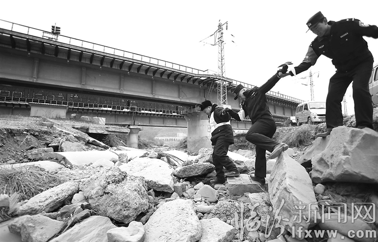 臨汾新聞網訊 1月9日,在國家重點工程——世界首條30噸重載鐵路瓦日鐵路(山西興縣瓦塘鎮至山東日照)蒲縣段,臨汾鐵路公安處民警巡邏時途經一處亂河灘。