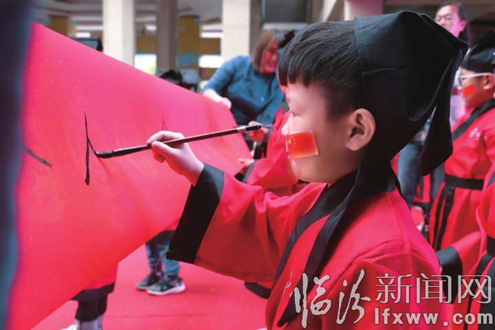 “開(kāi)筆”俗稱“破蒙”。開(kāi)筆禮,是我國(guó)傳統(tǒng)中對(duì)少兒開(kāi)始識(shí)字習(xí)禮的一種啟蒙教育形式,亦是古代讀書人必經(jīng)的“四大禮”中的第一禮。當(dāng)天,來(lái)自臨風(fēng)堂書畫院的42名蒙童頭戴黑色書生帽、身著纁紅色漢服長(zhǎng)袍,開(kāi)啟識(shí)字習(xí)禮教育,感知傳統(tǒng)文化魅力。