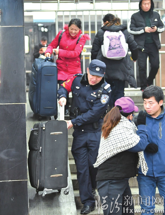 圖③ 日前,臨汾車站派出所民警幫助旅客搬運(yùn)行李。