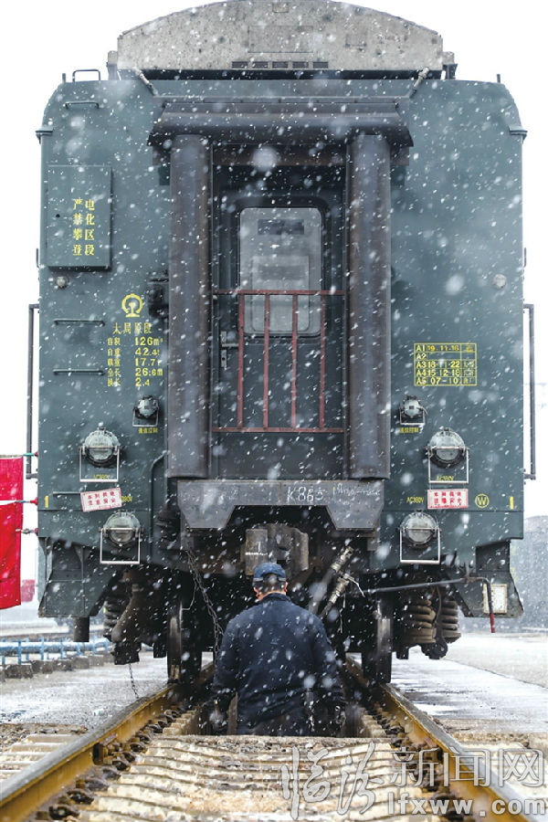 圖② 1月9日,太原車輛段臨汾運(yùn)用車間檢車員席亞斌在進(jìn)行車輛檢修工作。