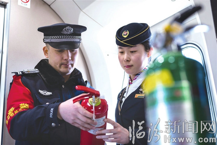 圖④ 1月8日,臨汾鐵路公安處乘警檢查列車安全設(shè)施。