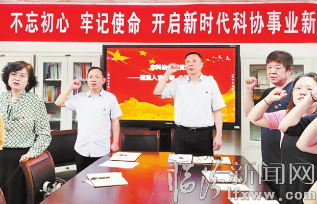 市科協(xié)黨組書記郭迎明(右三)在“七一”主題黨日活動中,與全體黨員重溫入黨誓詞。