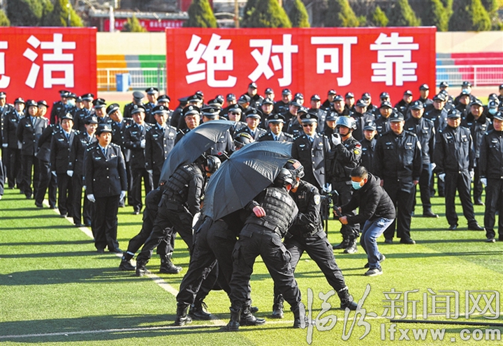 臨汾新聞網訊 1月5日,市公安局直屬分局在平陽中學操場開展迎首個“中國人民警察節”冬季練兵匯報演練活動,500余名干警現場展示了隊列會操、擒敵拳、警務實戰技能等科目內容。圖為干警正在進行小單元作戰演練。