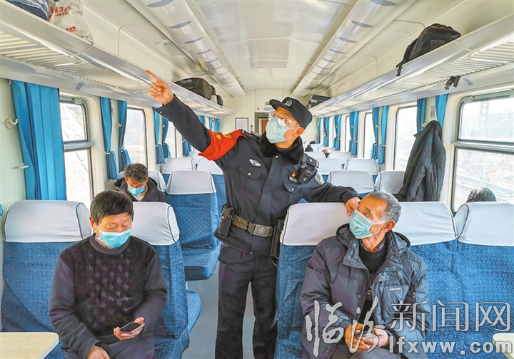 臨汾新聞網(wǎng)訊 2021春運工作中,臨汾鐵路公安處乘警支隊一手抓列車治安安全,一手抓疫情防控,讓旅客度過一段安全舒心的旅程。圖為春運首日,乘警在列車上提醒乘客玩手機時莫忘財物安全。