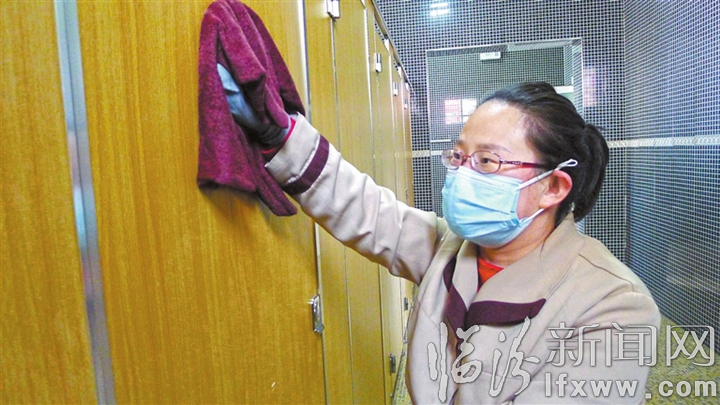 3月10日7時許,市環衛中心公共衛生服務大隊公廁管理員趙麗麗把上小學的孩子送到學校后,立即趕往解放東路所負責的公廁和同事交接班。完畢,她隨即對公廁里里外外的墻面、地面、隔板等進行徹底擦拭,遇到夠不著的地方,又爬上梯子去擦,熟練且利索。