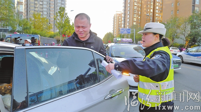 有人逆行,崔瓊慧立刻勸返;有人不戴頭盔,她耐心宣傳教育;有人隨意停放車輛,她予以警告并令其立即駛離;有人闖紅燈,她一個(gè)箭步上去,及時(shí)阻止……沿著解放西路、鼓樓西大街、中大街、濱河?xùn)|路一路下來,同樣的話語,她每天不知道要重復(fù)多少遍。