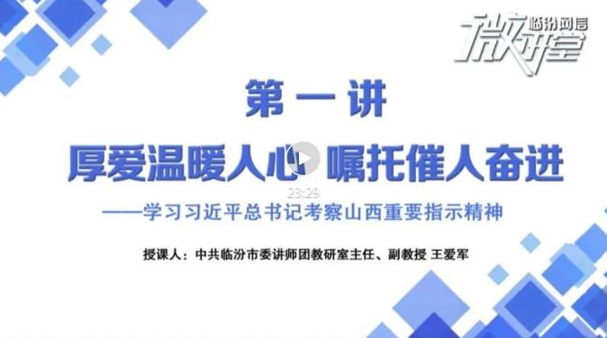 第一講題目:“厚愛溫暖人心 囑托催人奮進(jìn)” ——學(xué)習(xí)習(xí)近平總書記考察山西重要指示精神授課人:王愛軍,中共臨汾市委講師團(tuán)教研室主任,副教授職稱,山西省第三屆社科聯(lián)代表,臨汾市黨建研究會(huì)特邀專家,臨汾市公務(wù)員面試官專家?guī)斐蓡T,從事理論工作三十年,在省市級報(bào)刊雜志發(fā)表理論文章三十多篇,其中《以科學(xué)發(fā)展觀為統(tǒng)領(lǐng),力促臨汾經(jīng)濟(jì)跨越發(fā)展》獲山西省第十屆精神文明建設(shè)“五個(gè)一工程”優(yōu)秀理論文章獎(jiǎng)并有多篇文章被推薦參選省委宣傳部、省社科聯(lián)優(yōu)秀理論文章,對黨的政策,國際、國內(nèi)形勢、經(jīng)濟(jì)、民生及生態(tài)文明建設(shè)、反腐倡廉等方面有獨(dú)到的研究,講課注重理論結(jié)合實(shí)際。