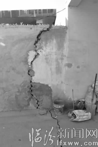 塌陷的路面致使張先生家的外墻裂開了一道縫。記者 蘇亞兵 楊全 攝