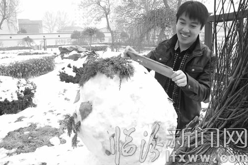 下班后,曹洪箐和同事迫不及待地在單位院里堆了一個(gè)大雪人。(文/圖記者 郝海軍)