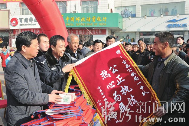 近日,吉縣壺口鎮陳家嶺村的村民張軍旺將一面寫有“公正執法、熱心為民”的錦旗送給了吉縣公安局,感謝他們為自己追回被詐騙的錢款。張軍旺去年因一起合同詐騙案被騙走91000元現金,接到報案后,吉縣公安局迅速組織警力進行案件偵破工作,并與春節前成功將犯罪嫌疑人抓獲歸案,同時將涉案資金91000元錢全部追回,并現場發還給受害人張軍旺。 黨源攝