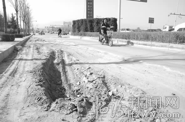隨后,記者第一時間趕到現場,遠遠看到,從濱河東路南延右轉進入迎賓大道,南側非機動車道不時會有大型卡車伴著塵土駛過。記者來到非機動車道上看到,不知何原因,非機動車道路面一半是水泥的,一半是砂石的,由于經常有大卡車從此經過,砂石一側留下了深深的車轍。記者觀察發現,就在距離深坑不遠處,一個下水道窨井蓋被壓碎,下水道暴露無遺,記者透過井蓋看到,該下水道窨井深3米左右,其下還有幾根管道。與此同時,記者還看到,張女士所說的非機動車道破損嚴重,指的就是從河東路南延右轉進入迎賓大道開始,一直向東延伸大概100米的路段。