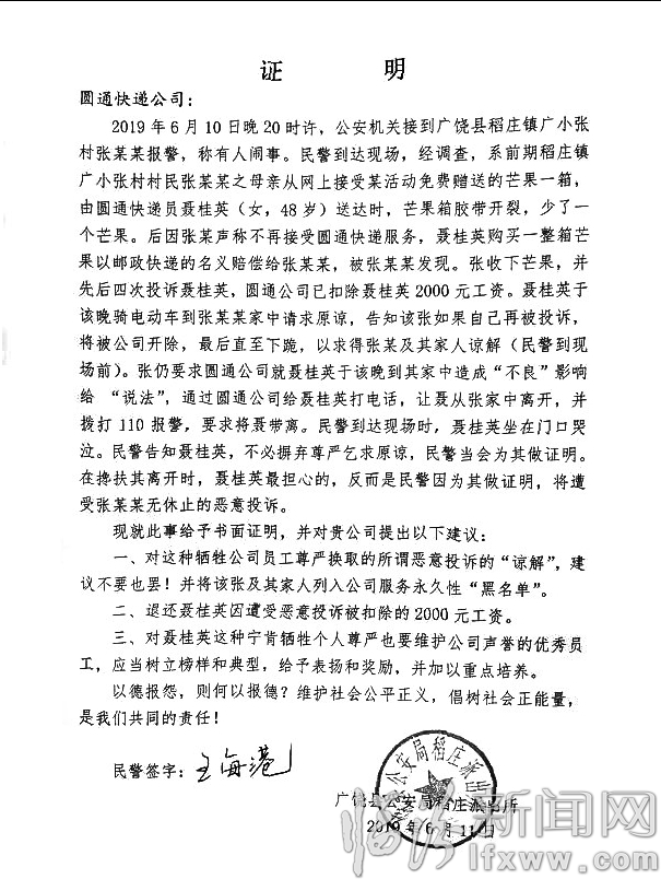 臨汾新聞網訊 因為少了一個芒果,快遞員賠了客戶一整箱,仍被投訴4次,扣款2000元。走投無路的女快遞員無奈跪倒在客戶腳下,以求得客戶及其家人諒解,對方卻給圓通打電話要求“給說法”,并報警趕人。民警接警并了解情況后,專門出具了一份證明,并在證明中,建議圓通公司將收件人及其家人列入圓通公司服務永久性“黑名單”。“犧牲公司員工尊嚴換取的所謂惡意投訴的‘諒解’,建議不要也罷!”這份證明寫道。