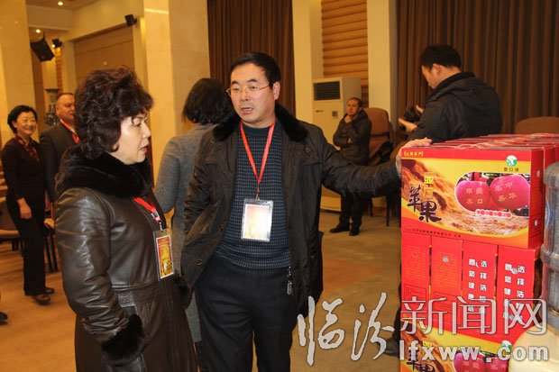 首屆關公獎新聞發布會于2013年元月13日在國務院新聞辦舉行,郭小安(右)在向參會記者推介吉縣“壺口牌”蘋果。