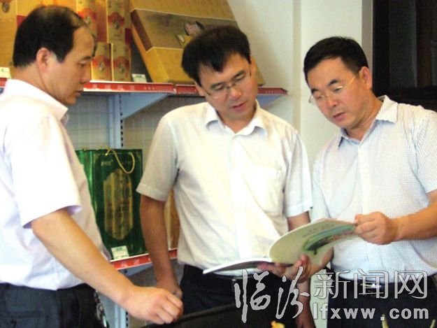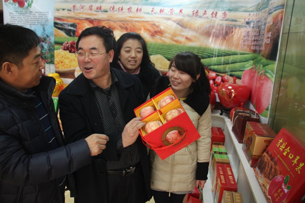 吉縣縣委副書記、縣長劉浩(中)在北京浩恒峰商貿有限公司調研吉縣蘋果銷售情況