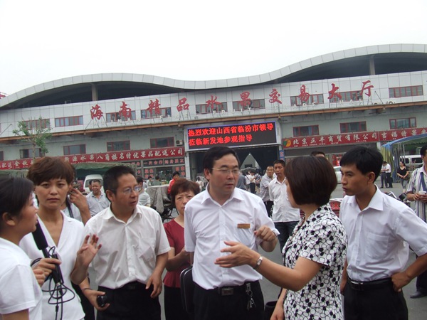 圖為吉縣蘋果(北京)銷售公司董事長郭小安向吉縣縣委副書記李靈芝介紹該公司在新發地經營情況
